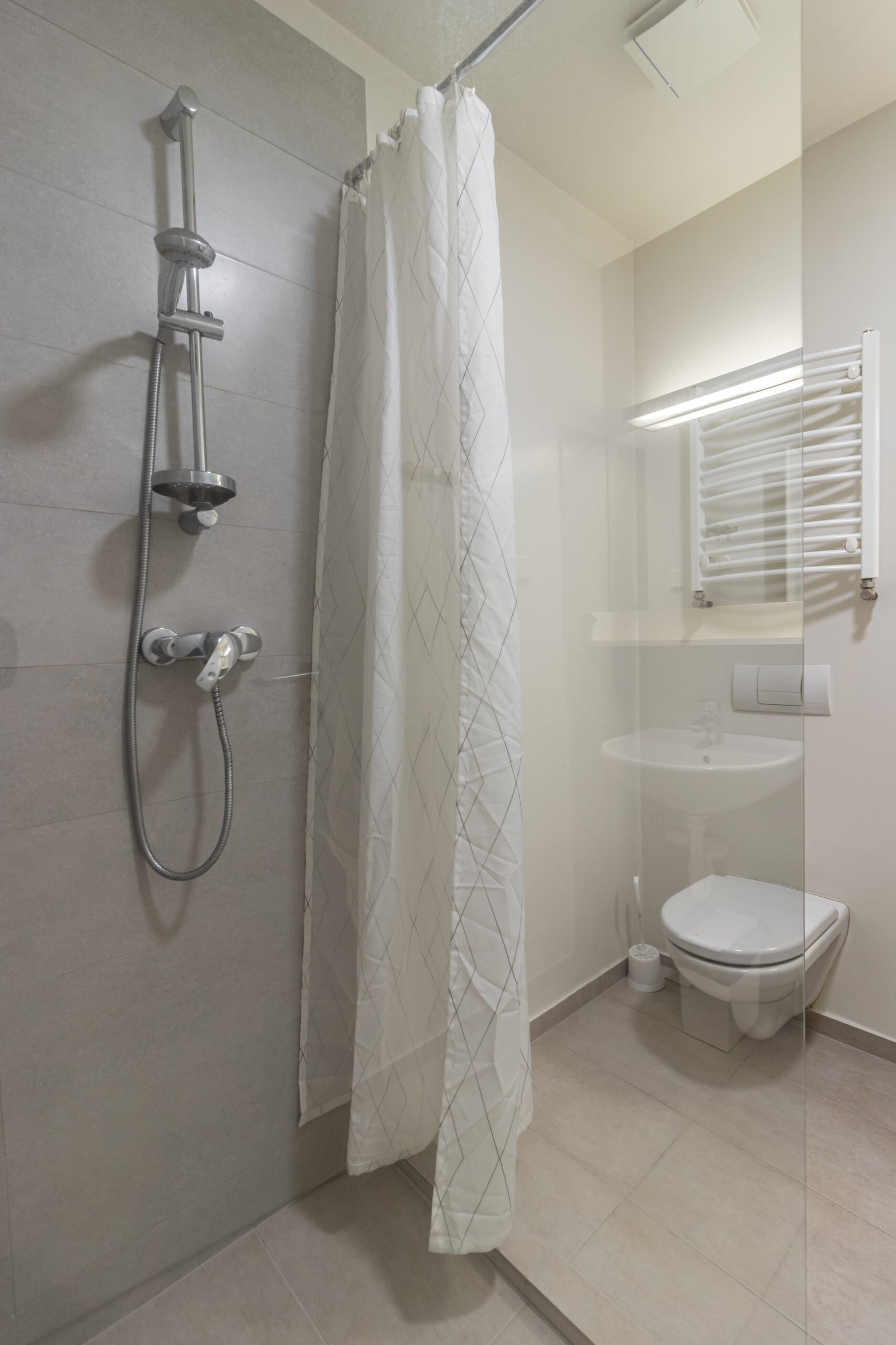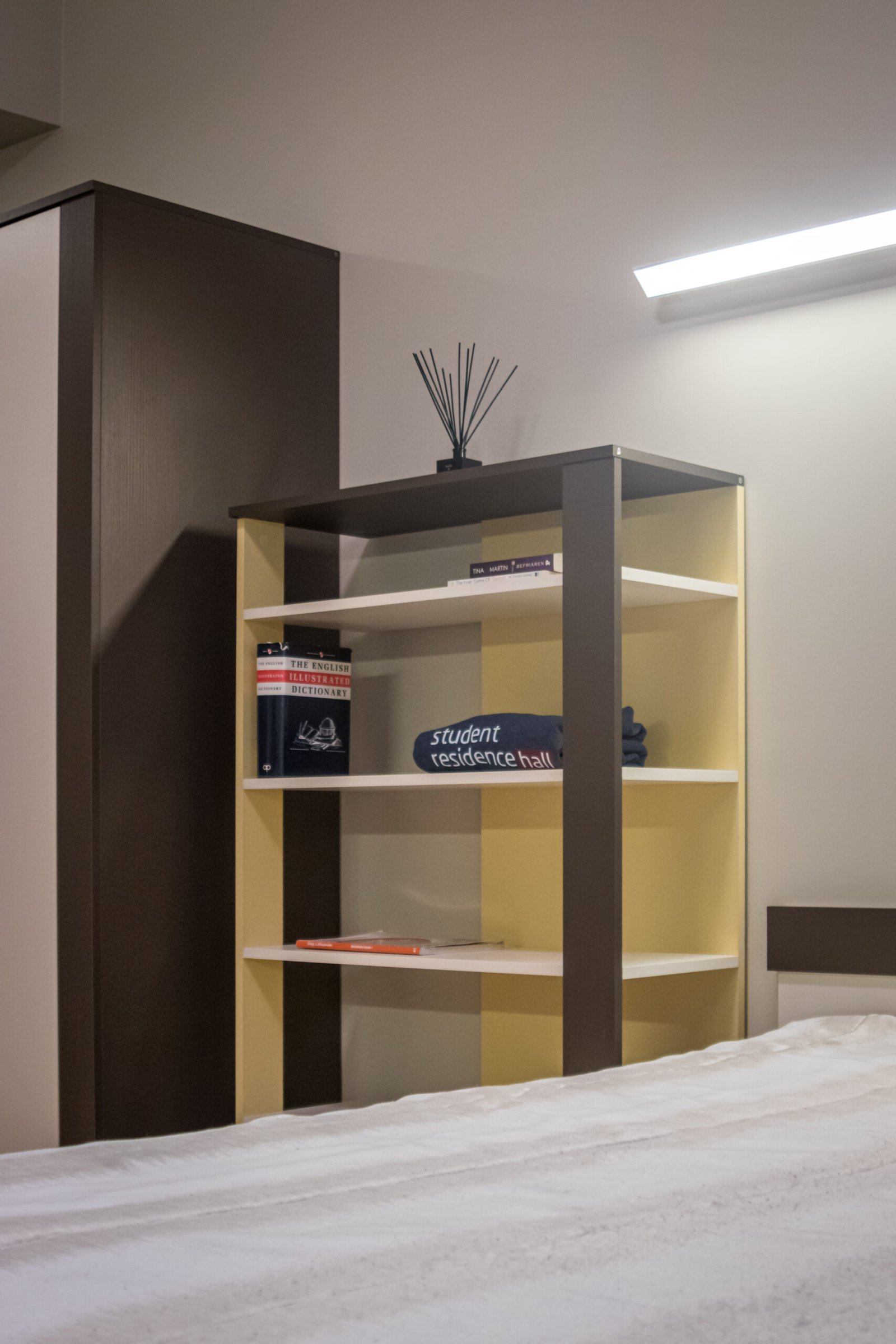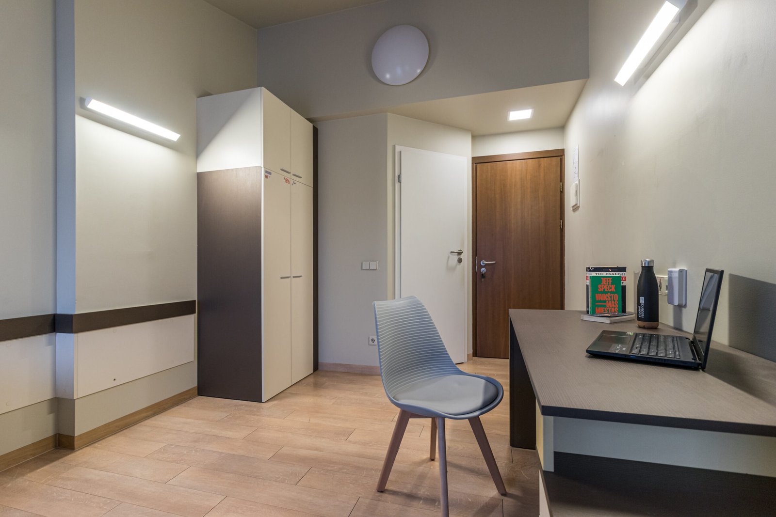 Every medium student room in Kaunas includes a high-quality single bed (120×200 cm mattress), a dedicated study area with a writing desk and chair, a bookshelf, and a spacious wardrobe for all your belongings. The private bathroom is fitted with modern fixtures, including a shower, toilet, and sink, ensuring privacy and convenience without the need to share facilities. Some rooms may vary slightly in layout or design, giving you the option to choose what best suits your taste.
